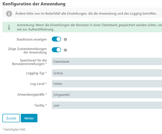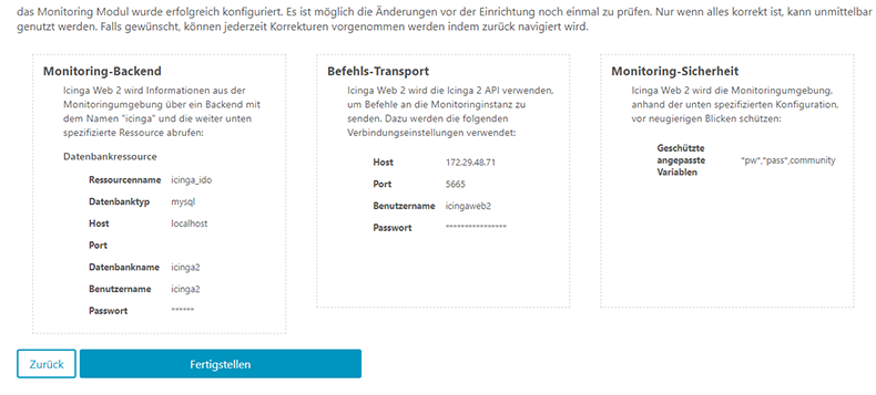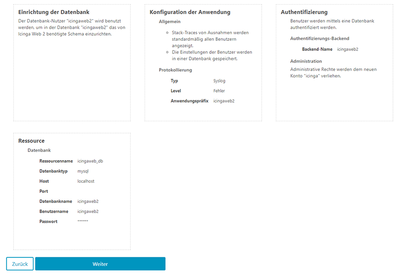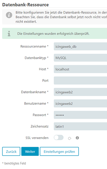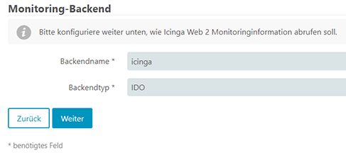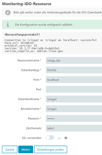 Wir geben an dass wir das IDO-Modul verwenden möchten und diese Ressource mit dem Namen „icinga“.