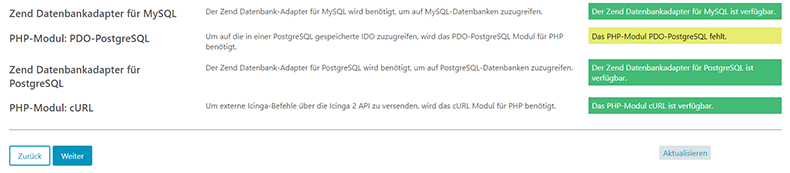 Nun wird geprüft ob alle Voraussetzungen erfüllt sind. Einzig die PostgreSQL Module werden hier als fehlend angezeigt was aber nicht weiter schlimm ist, da wir ja die MariaDB als Datenbank verwenden und nicht PostgreSQL.